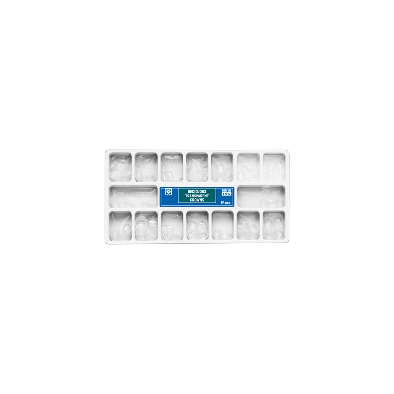 Deciduous Transparent Crowns64 pcs.:for premolars and molars (upper & lower jaw, small, medium, large) - 32 pcs. for incisors and cannines (upper & lower jaw, small, medium, large) - 32 pcs. |